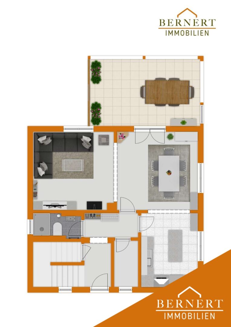 Im Erdgeschoss befindet sich ein großzügiger offener Wohn – und Essbereich mit Anschluss an die Küche. Der Raum ist L-förmig angelegt, dadurch bekommen die einzelnen Bereiche eine Abgeschlossenheit. Vom Essbereich gelangen Sie auf die überdachte Terrasse und in den Garten, – perfekt für ein Frühstück in der Sonne. Die Küche ist mit hochwertigen Möbeln und Geräten ausgestattet – beim Kochen können Sie mit Ihren Gästen im Esszimmer kommunizieren. Der Abstellraum bietet ausreichend Platz, um die Dinge des Alltags zu verstauen. Eine Gästetoilette mit Dusche und Fenster befindet sich direkt neben dem Eingang. Der Flur bietet ausreichend Platz für Ihre Garderobe.